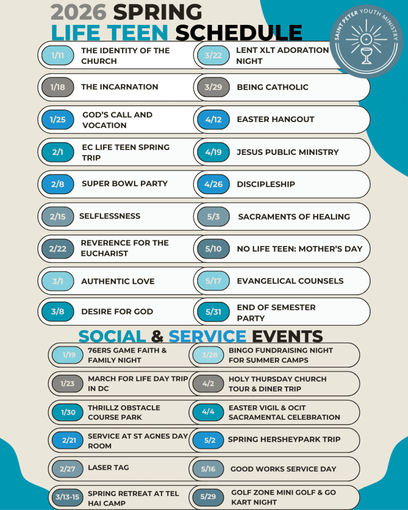 Life Teen is an international Catholic Youth Ministry organization with the mission of leading teens closer to Christ. Life Teen Youth Ministry at Saint Peter Parish is a vibrant and joyful community of high schoolers with a desire to grow in a personal relationship with Jesus Christ. Life Teen gathers weekly Sunday evenings from 6pm to 8pm in the Celebration Center. Our Life Nights bring together our incredible high school community as we grow together in faith, fellowship, and fun! Want to join? Register here! It’s totally free!